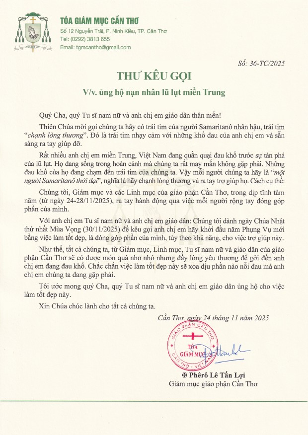 Tòa giám mục Cần Thơ - Thư kêu gọi ủng hộ nạn nhân lũ lụt miền Trung (ngày 24/11/2025)