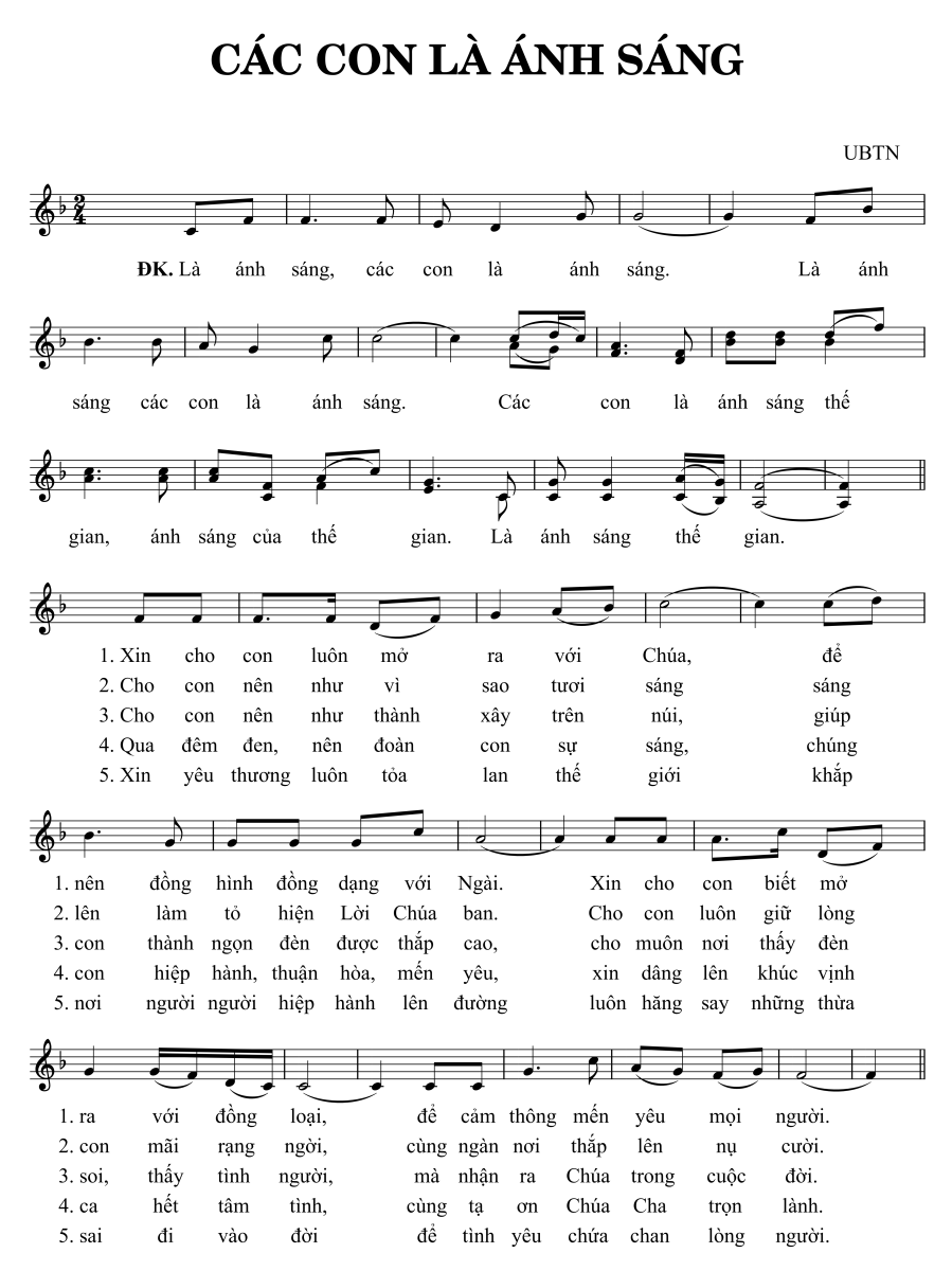 Đáp ứng nhu cầu của cộng đoàn dân Chúa tại Việt Nam muốn có được bài ca chủ đề cho năm 2026: Mỗi kitô hữu phải là một môn đệ thừa sai như lời Chúa Giêsu dạy: “Anh em là ánh sáng thế gian” (Mt 5,14.15). Ủy ban Thánh nhạc trực thuộc Hội đồng Giám mục Việt Nam trân trọng giới thiệu bài thánh ca: “Các con là ánh sáng”. Bài này có thể hát Ca nhập lễ, Ca tiến lễ, Ca hiệp lễ và Ca kết lễ trong Thánh lễ. Cũng có thể sử dụng khi chia sẻ ngoài Phụng vụ. Ủy ban Thánh nhạc sẽ gửi bản phối và hát sau.