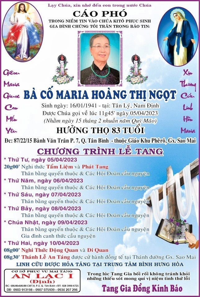 Cáo phó: Bà Cố Maria Hoàng Thị Ngọt