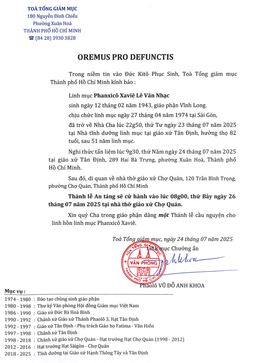 Cáo phó Linh mục Phanxicô Xaviê Lê Văn Nhạc