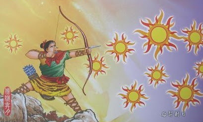 Bấy giờ, có 10 mặt trời cùng lúc tồn tại, cứ một mặt trời thì chiếu một ngày, và cứ thay phiên như vậy trong vòng một ngày. Tuy nhiên, tai họa ập đến, một ngày kia cả 10 mặt trời cùng xuất hiện trong một ngày và đã thiêu cháy hầu hết sinh linh trên mặt đất. Trước hoàn cảnh “ngàn cân treo sợi tóc” trên, Vua Nghiêu đã sai Hậu Nghệ bắn rơi 9 mặt trời chỉ để một cái lại mà thôi. Chàng Hậu Nghệ đã hoàn thành sứ mạng xuất sắc.
