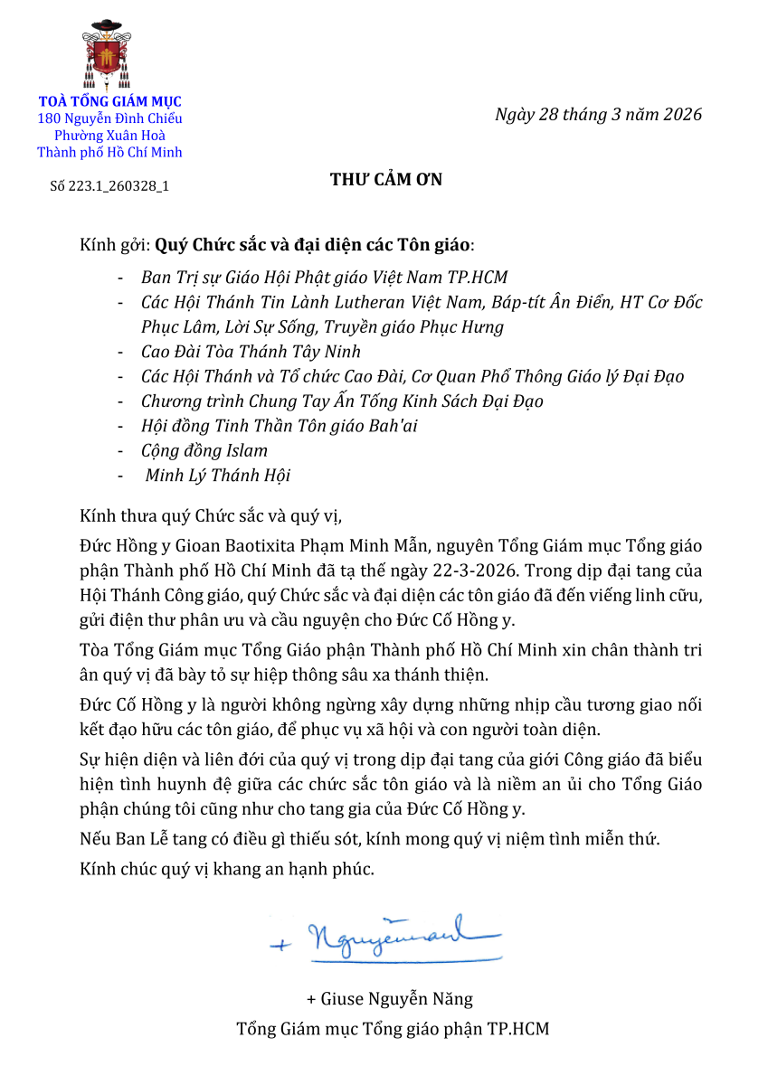 Thư cảm ơn quý chức sắc và đại diện các Tôn giáo