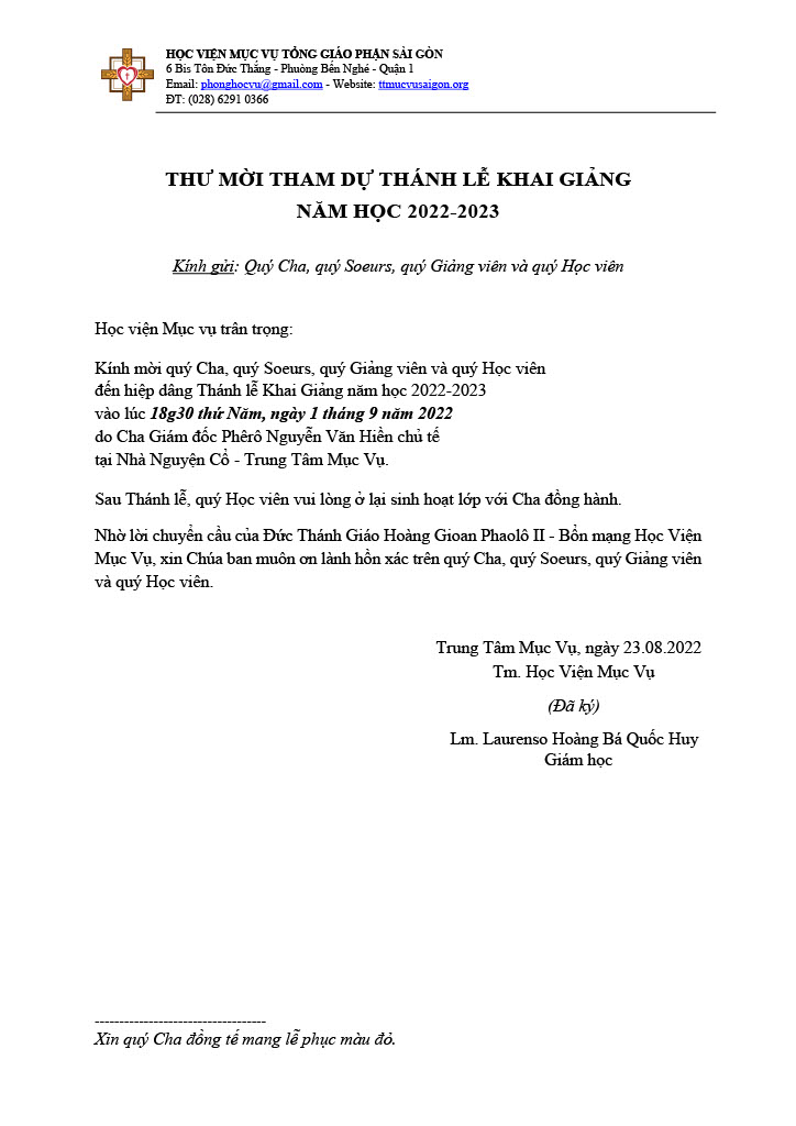Thư mời tham dự Thánh lễ Khai giảng năm học 2022-2023